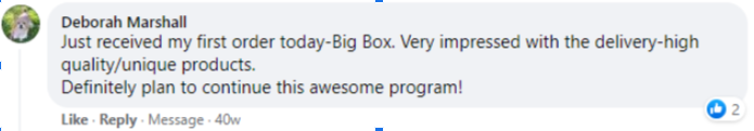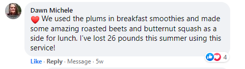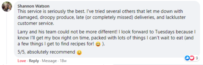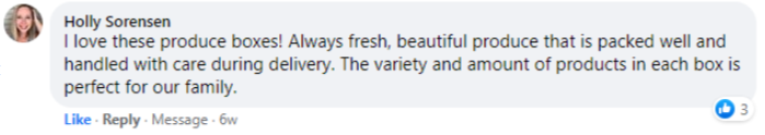 Our prices tend to be very competitive compared to the big chain grocery stores. And of course, the quality of our products is superior to the grocery store plus we bring it right to your door.